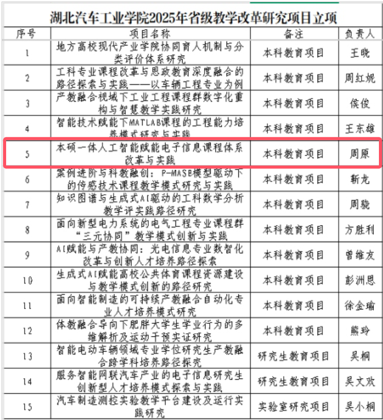 近日,省教育厅发布《省教育厅关于公布2025年湖北本科高校省级教学改革研究项目的通知》《关于2025年湖北省高等学校实验室研究项目立项的通知》。湖北汽车工业学院凭借扎实的教学研究基础与创新申报方案,共有 15 个项目成功获批。其中,人工智能学院周原副教授获批一项本科教育类项目。